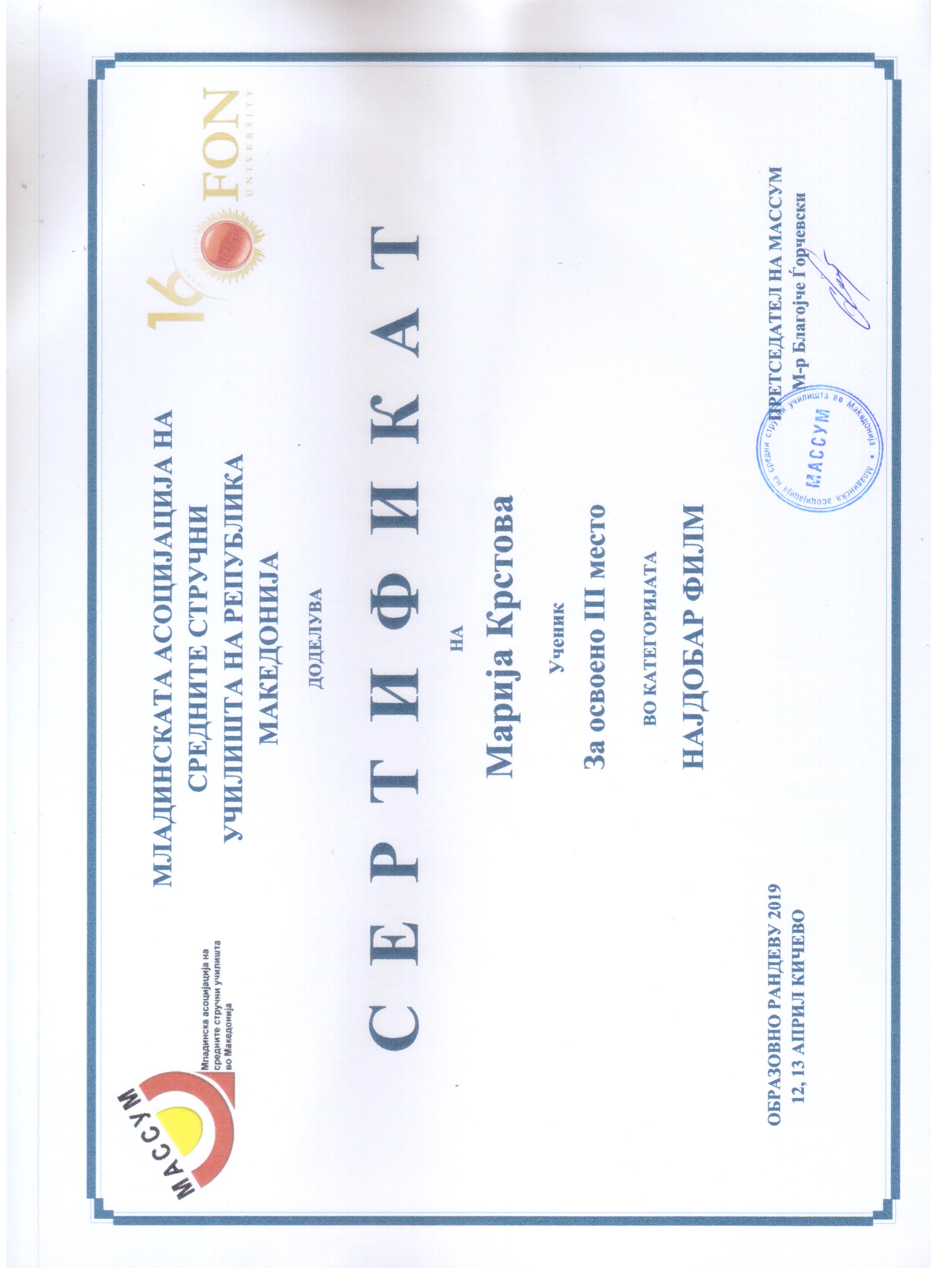 | 12 - 13.04.2019 | Сертификат за ученик Марија Крстова во категоријата Најдобар филм на Образовно Рандеву 2018 |