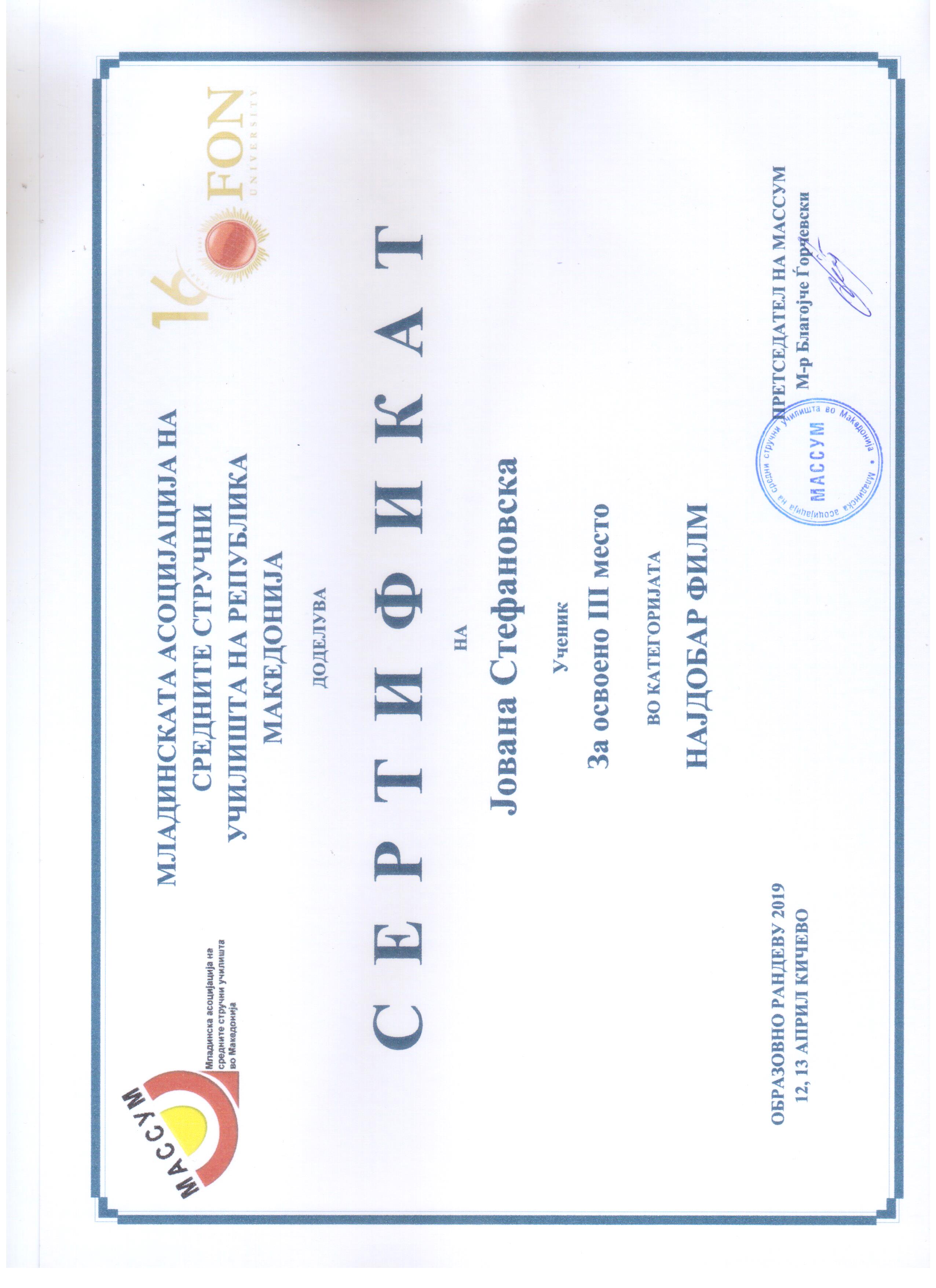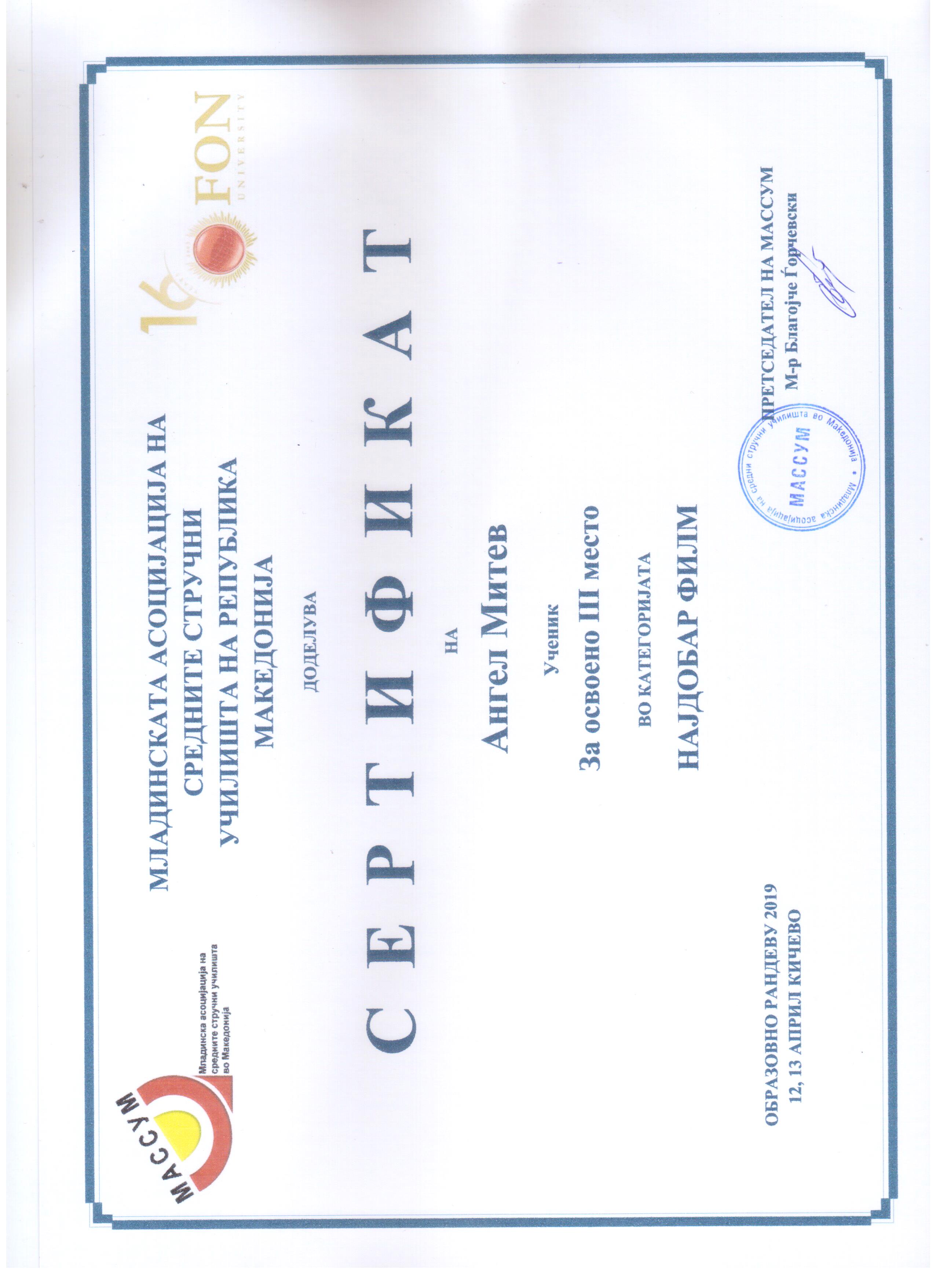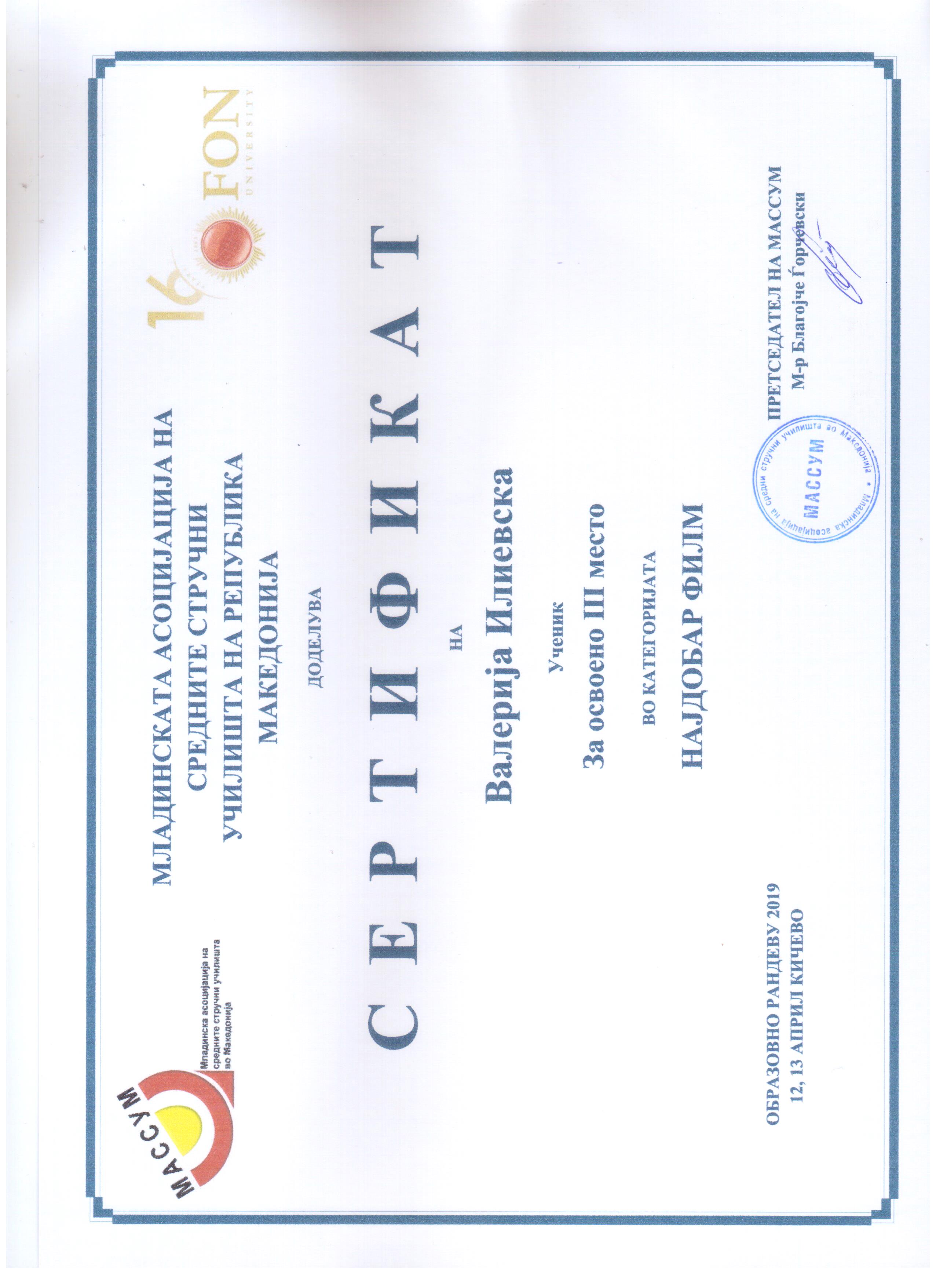 | 12 - 13.04.2019 | Сертификат за ученик Валерија Илиевска за освоено III место во категоријата Најдобар филм на Образовно Рандеву 2018 |