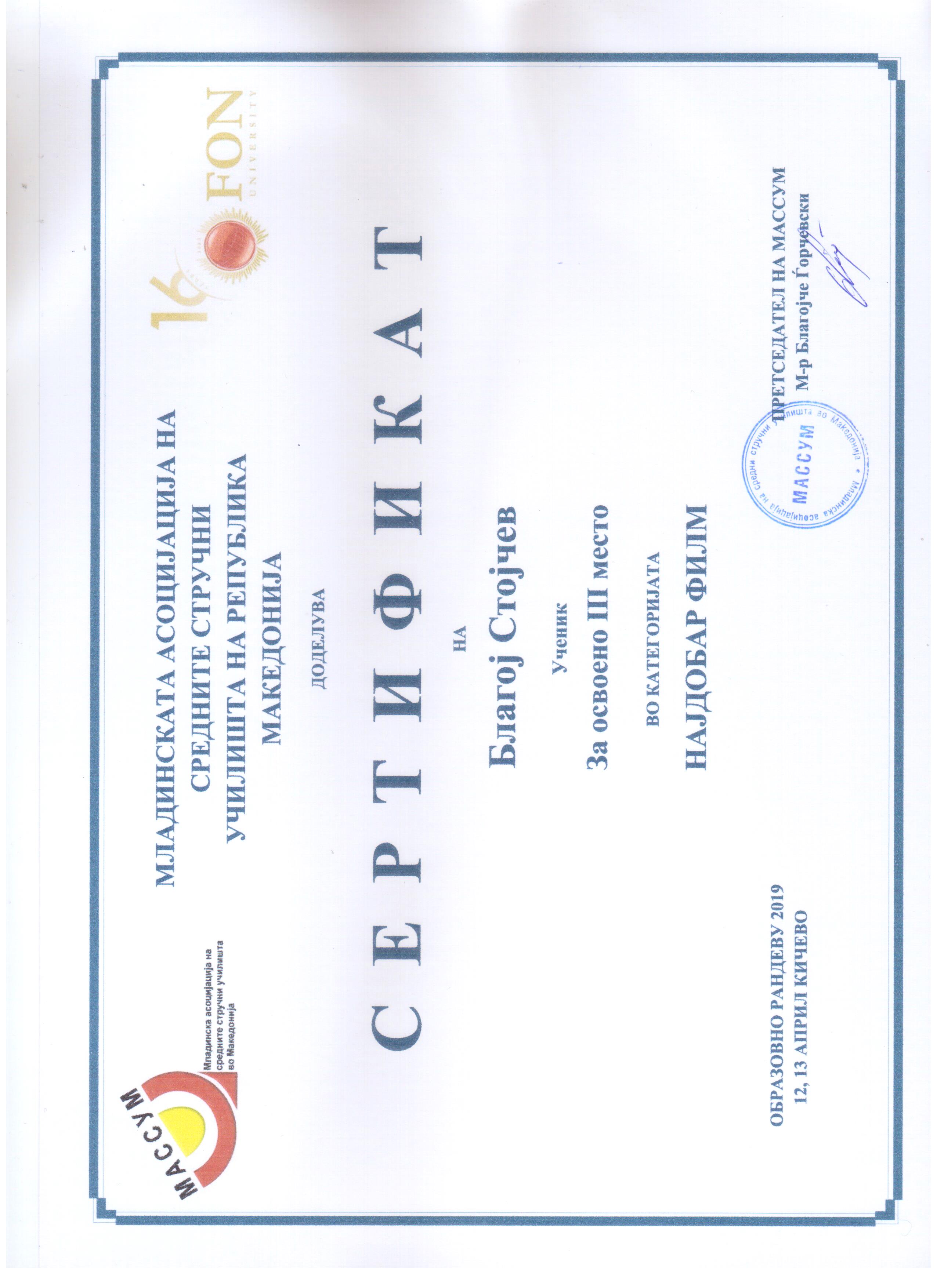 | 12 - 13.04.2019 | Сертификат за ученик Благој Стојчев во категоријата Најдобар филм на Образовно Рандеву 2018 |