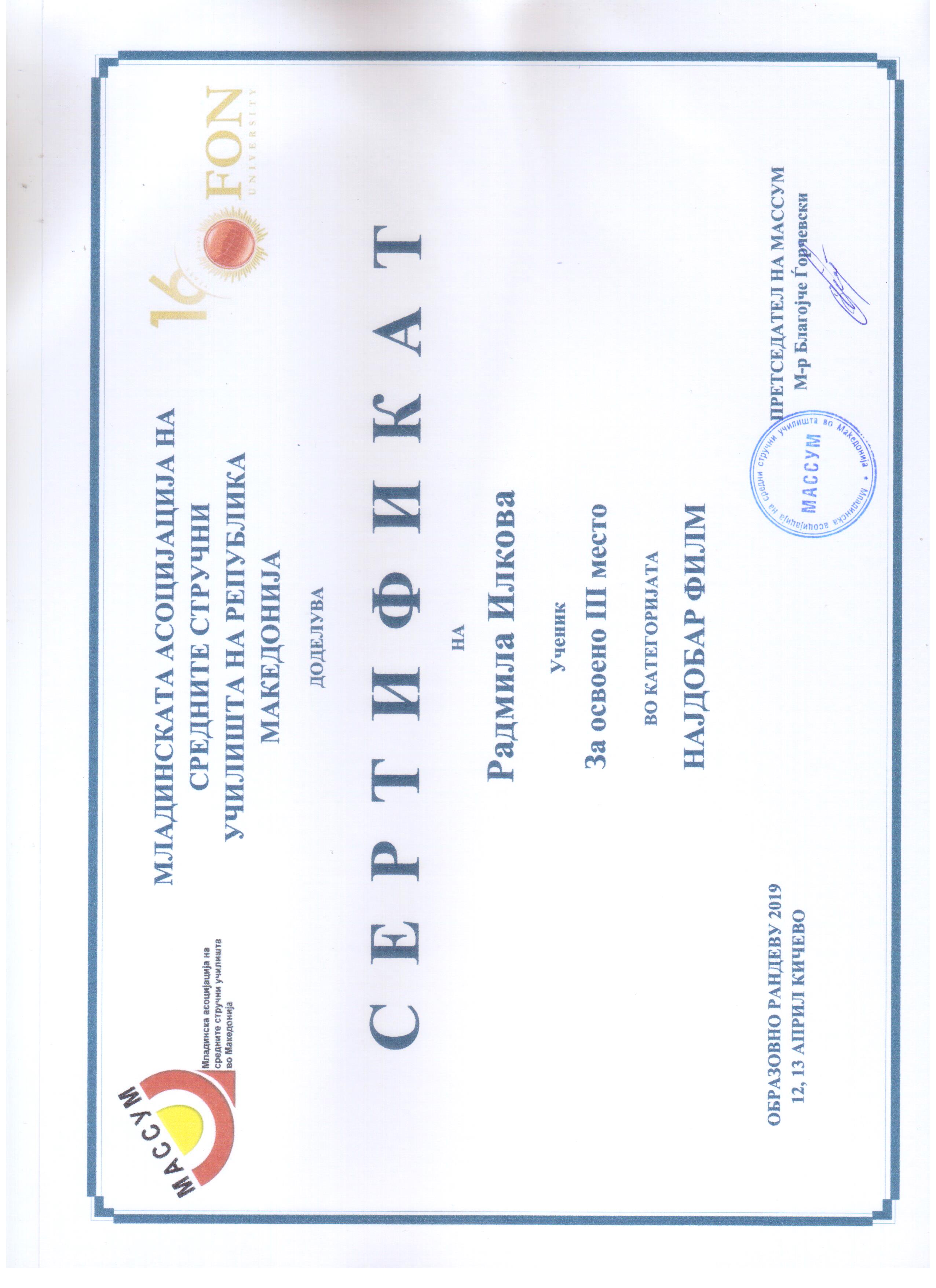| 12 - 13.04.2019 | Сертификат за ученик Радмила Илкова во категоријата Најдобар филм на Образовно Рандеву 2018 |
