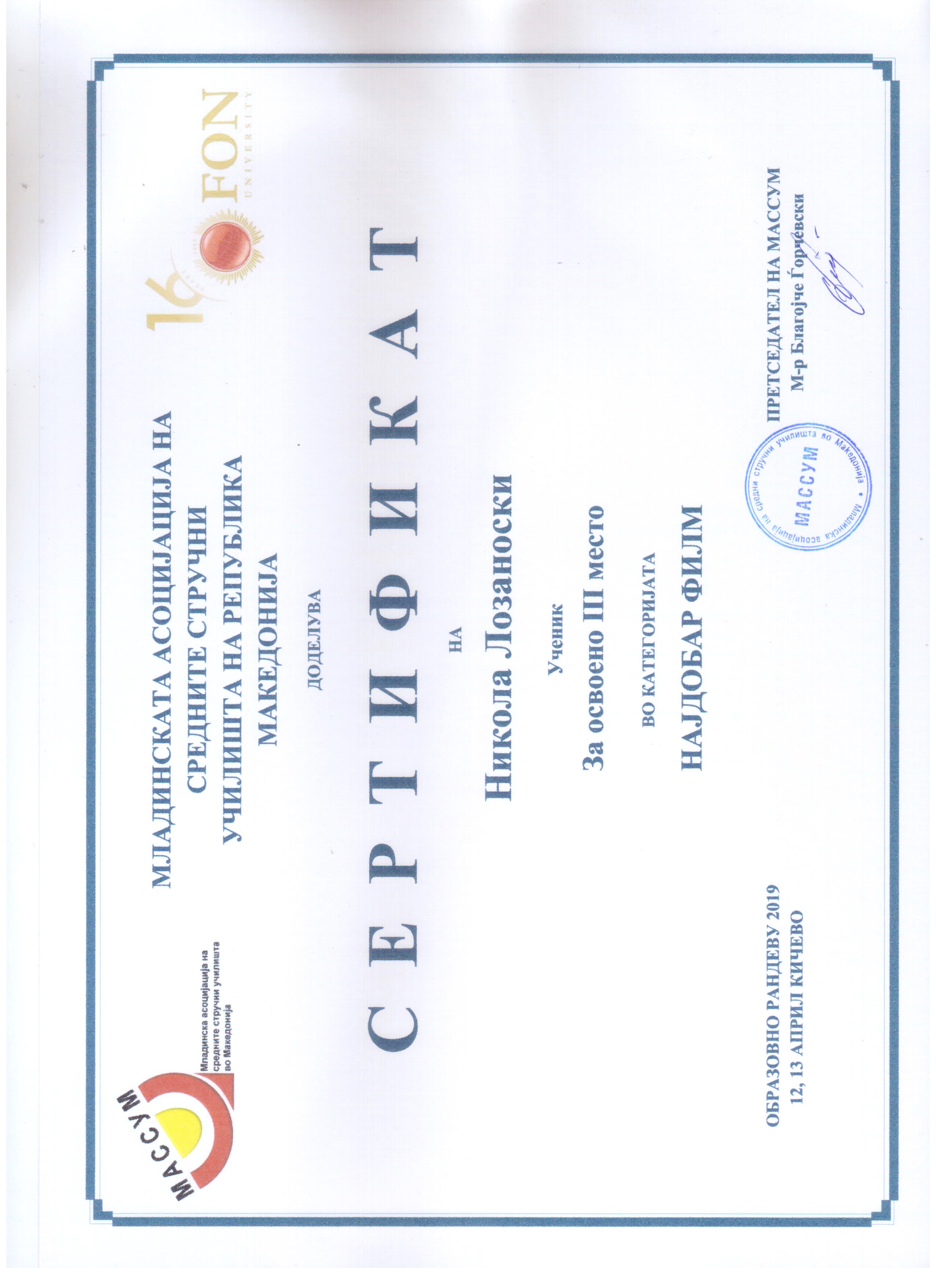 | 12 - 13.04.2019 | Сертификат за ученик Никола Лозаноски во категоријата Најдобар филм на Образовно Рандеву 2018 |
