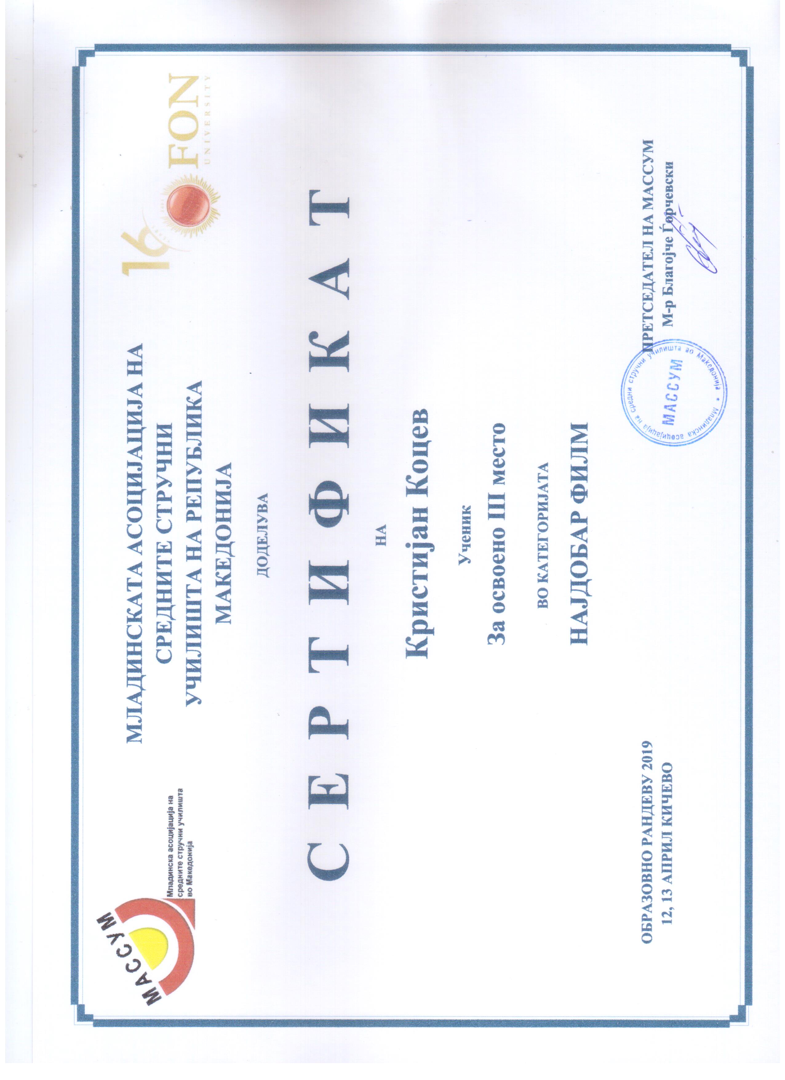 | 12 - 13.04.2019 | Сертификат за ученик Кристијан Коцев во категоријата Најдобар филм на Образовно Рандеву 2018 |
