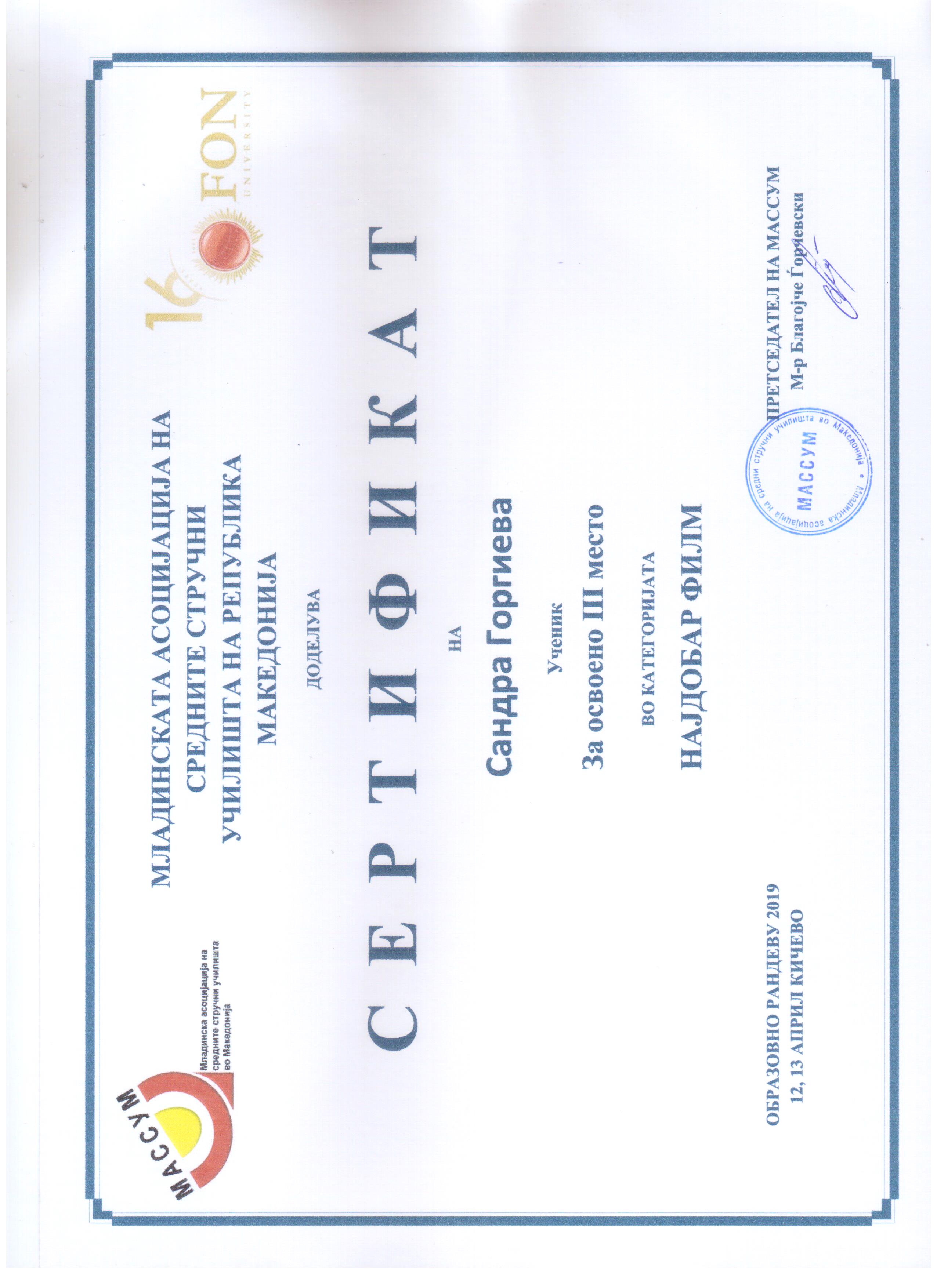 | 12 - 13.04.2019 | Сертификат за ученик Сандра Горгиева во категоријата Најдобар филм на Образовно Рандеву 2018 |